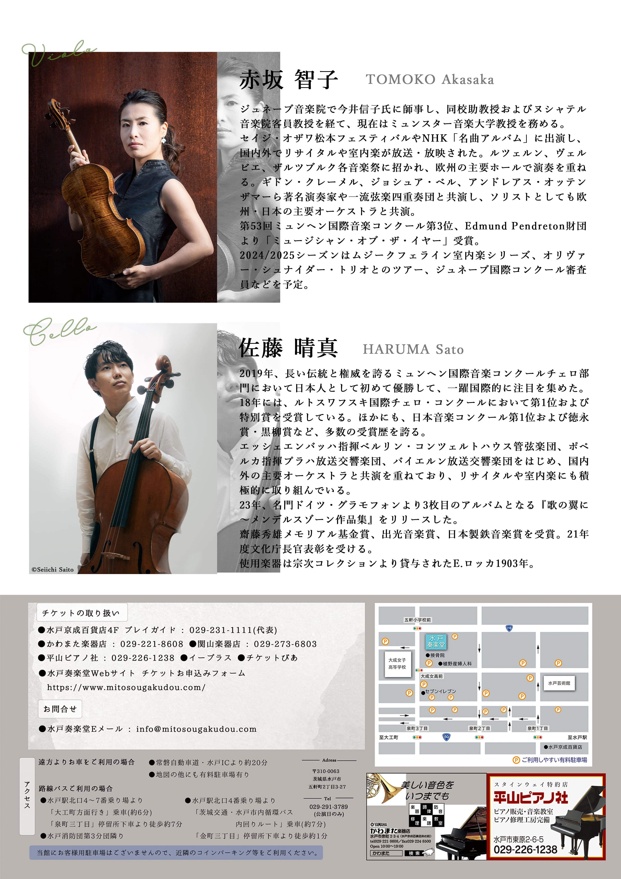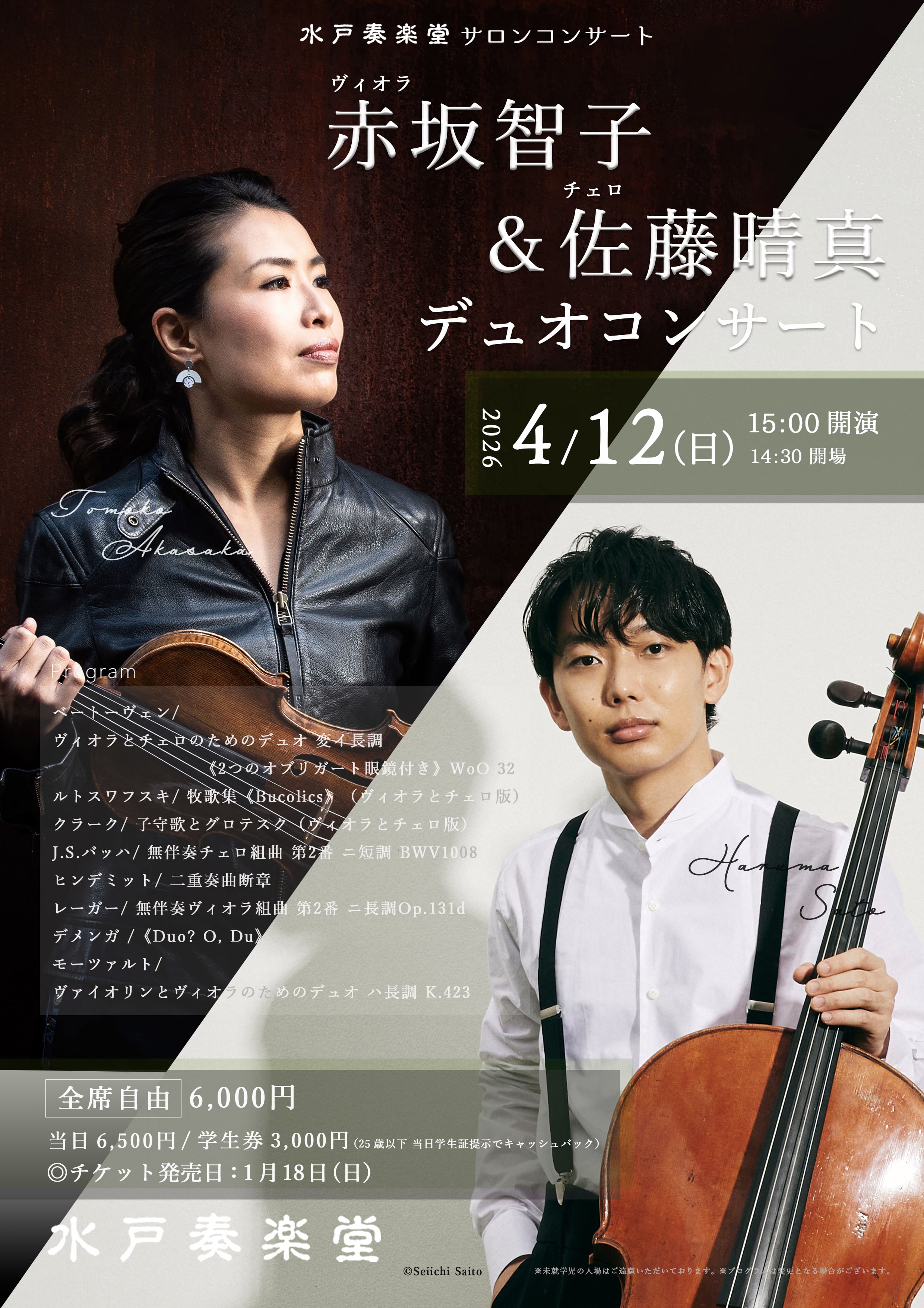 ヴィオラの赤坂智子と、2019年ミュンヘン国際コンクール第1位の佐藤晴真。ヴィオラとチェロの美しいデュオを楽しめます。
